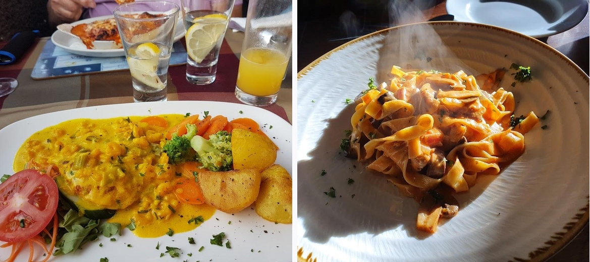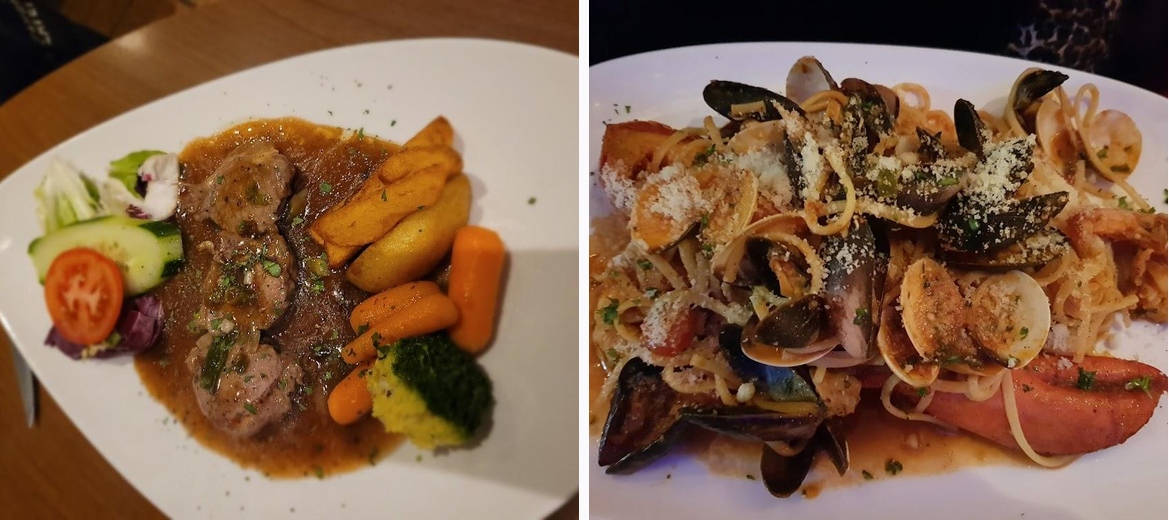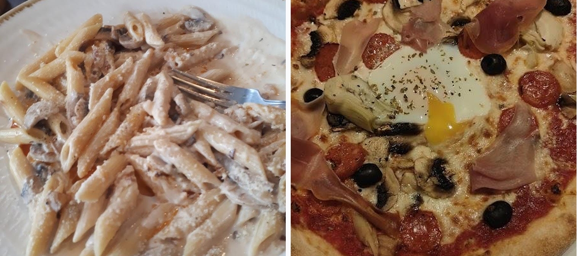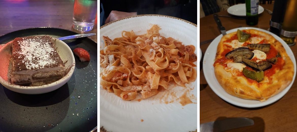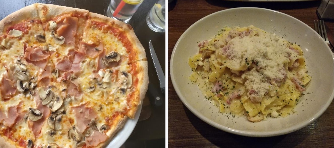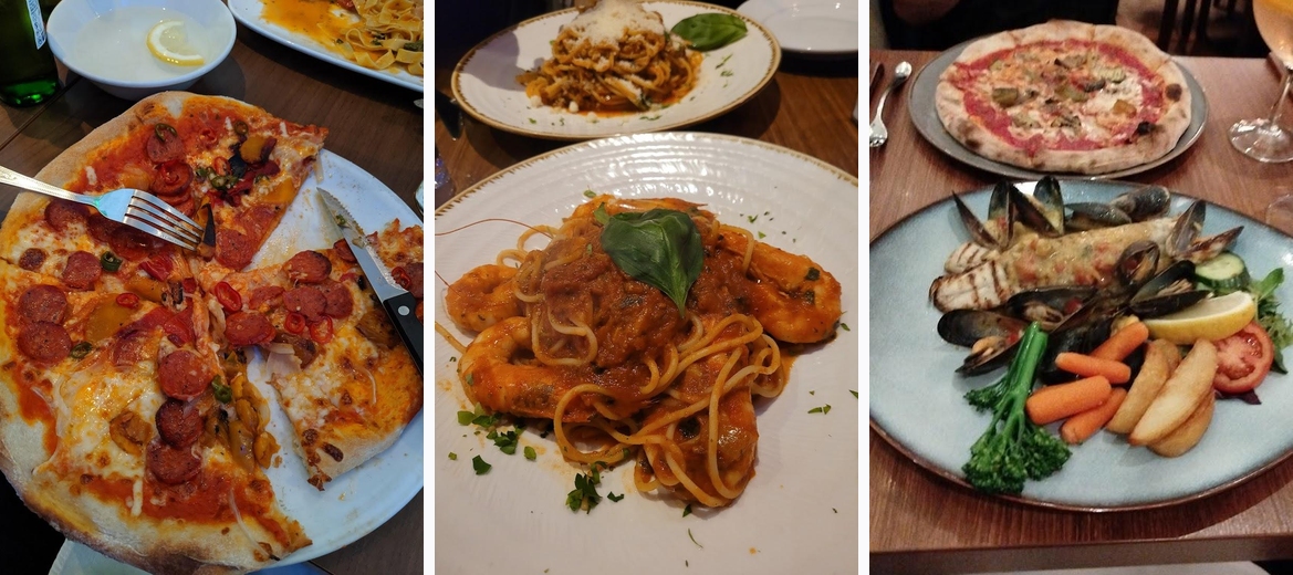 We went as a group of 8, the garlic bread portions are enough for 2, the calamari and bruscetta was lovely. Mains were mostly pizza which was good. The pasta was delicious and the chicken with mushroom sauce was very tasty. The tiramisu was a good portion size and really nice. Great service.